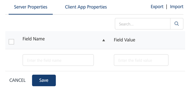 If you have not configured any property, the Server Properties tab displays a blank row where you can enter the key value pair. If the properties are available, by default, they are displayed in an alphabetical order (ascending) based on Field Name. The provision to add a new key value pair is provided at the bottom.