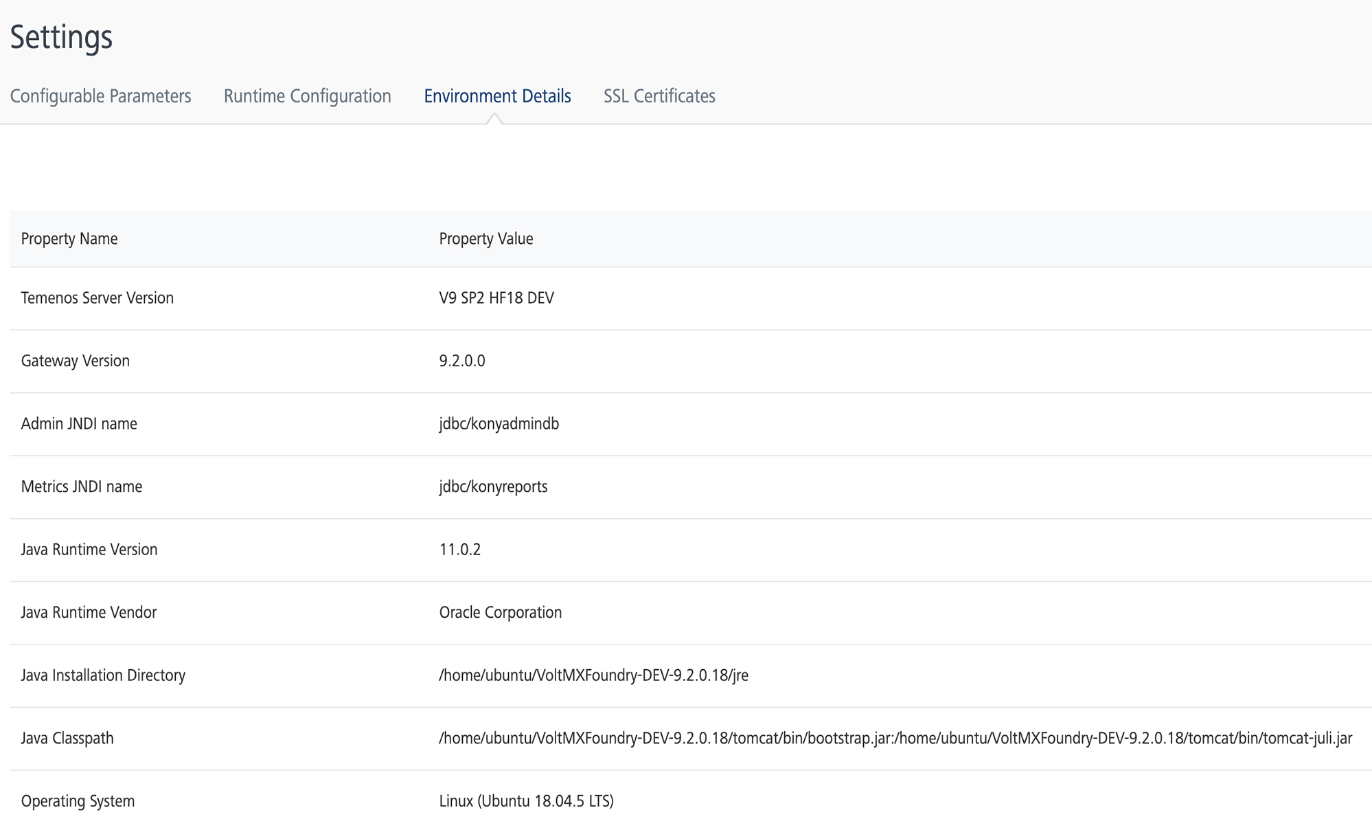 The environment details page displays the environments details of the Volt MX server. This page displays a table with two columns the Property Name and Property Value.
