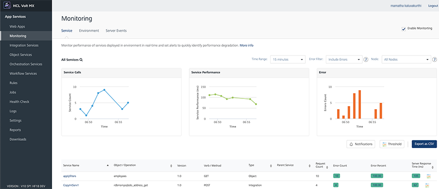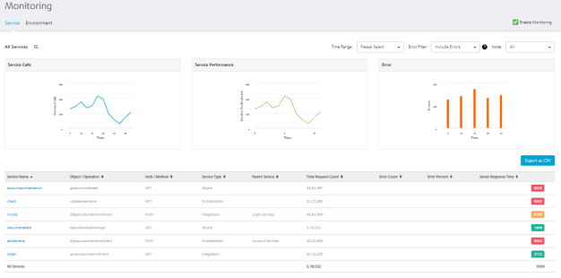 Field Description Service Name Name of the displayed service. Click the service name to navigate to the test page of the selected service.> Note: Click on a specific row of a service (other than service name) to view the statistics of that service. To revert to the default graphs page, click anywhere else on the screen. Object/Operation The object for the Object service or the operation created for the Integration/Orchestration service. Verb/Method The verb (or) method created for the service. Service Type Type of the created service. (example: Object Service, Integration Service and so on.) Parent Service Details of the parent service associated with the service.Example: If an Integration service is part of an Orchestration service and invoked as part of Orchestration service, the orchestration service name is displayed in the parent service and integration service name is populated in the service name field. Total Request Count The count of total requests sent from the service within the selected time range. Error Count Count of the errors received from the total requests sent. Error Percent Percentage of the errors received from the total requests sent. Server Response Time Time taken to respond by the server for the received request.Mouse over across each row in the server response time column, to view the time split taken by each process in the server to send the response. Enable Service Monitor Select the checkbox to enable the service monitor. Clear the checkbox to disable the service monitor feature.> Note: If the Service Monitor is disabled, it logs the metrics in the DB if the log level is Debug.> Note: If Log Level type is set as Debug or lower in Client Log Level filter, service monitoring is captured only for the users matching the filter criteria in the log. If the service monitoring feature is enabled, the client log level set has no effect on it and data is collected for all the users. For more information on client log filters, refer Log Level by Client Filter. Note: Monitoring has no perceptible performance impact and it is highly recommended to keep the feature enabled.