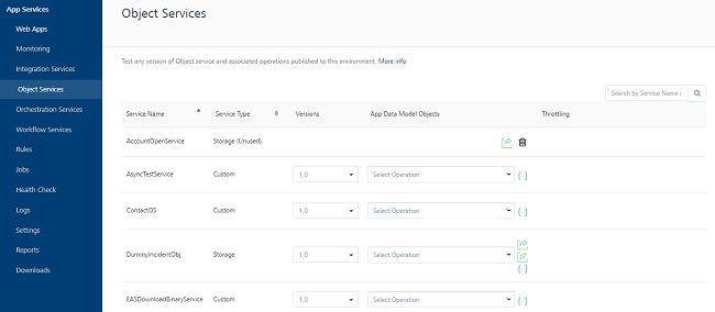 The object services are used test the defined app data model in Volt MX Foundry Console. The services defined and published in the Object Services tab of Volt MX Foundry Console are displayed in the page. You can test the app data model objects of each service defined using different operations available. To know more, refer Object Services.
