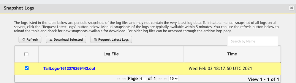 | Download Selected Logs | Select the desired logs and click Download Selected to download the selected logs. For more information, refer Download Selected Snapshot Logs. |