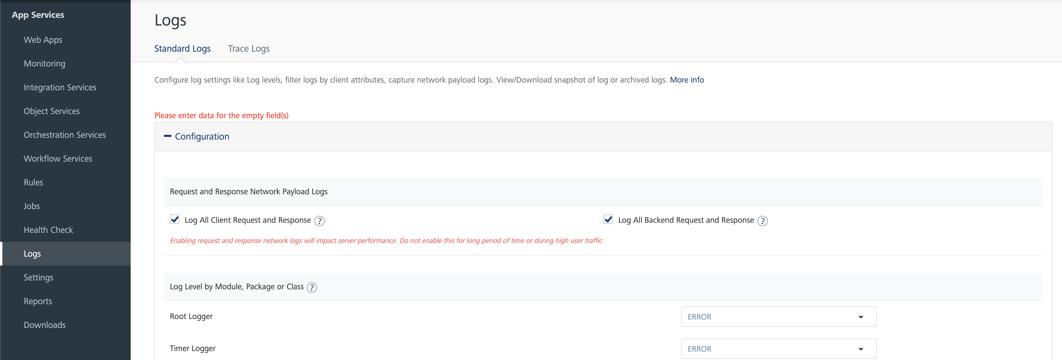 Note: Enabling full request and response trace logs will impact the server performance. So, do not enable the trace for long periods or during the high traffic.