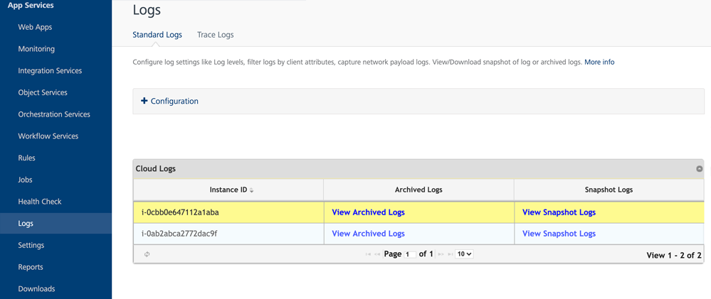 The Cloud Logs view in Volt MX Foundry App Services Console enables you to verify server logs in the cloud environment. The page displays a list of instances with Instance ID and the links to view the Archived and Snapshot Logs. If the number of logs is more than 10, you can use the Next or Previous options.