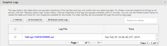 Snapshot Logs include the last manual log snapshot fetched from the server. The logs listed in the table are periodic snapshots of the log files and could not contain the latest log data. You can view and download the snapshot log files. You can initiate manual snapshot of all the logs on all the servers. If the number of snapshot log files are more than 10, you can use Next or Previous options.
