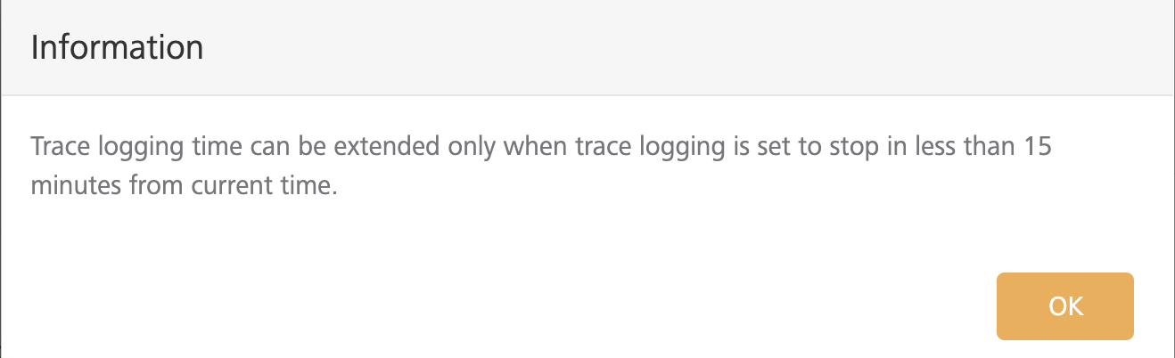 Trace log can be extended only by fifteen minutes from the current duration. If the current expiry time is greater than fifteen minutes from the current time, a message appears stating the current expiry time cannot be modified.