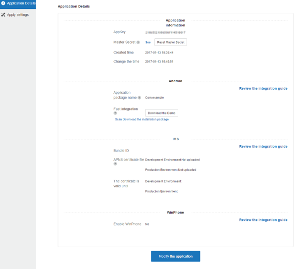 The Application Details page appears. The Application Details page displays the Appkey and the Master Secret.