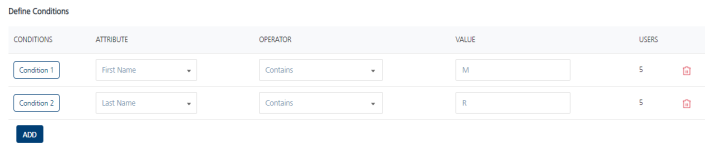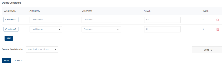 Execute Conditions By: Select the execute condition as Match all conditions or Match any condition from the drop-down list. Based on the fulfilled condition, the system inserts the number of users that qualify for the segment under the Users column.