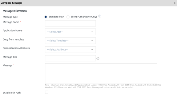 The Compose Message window appears. The Compose Message window includes Message Information section to add a new push message. The Message Type field includes two options to add a new push message: