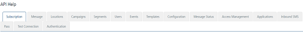 Message, Locations, Campaigns, Segments, Users, Events, Templates, Configuration, Message Status, Access Management, Applications, Inbound SMS, Pass, Test Connection, and Authentication