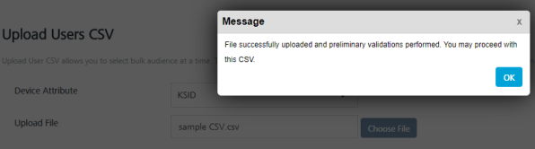 The Upload User CSV option allows you to select bulk audience at a time. The CSV file needs to have a single column of entries of the attribute. Each entry should be in a new line with no space in between.
