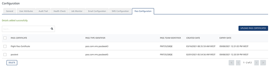 The uploaded certificate appears in the Pass Configuration list view and system displays the confirmation message that details added successfully.