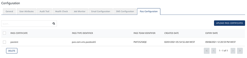 In the Configuration page, click the Pass Configuration tab. The system displays the Pass Configuration page. The Pass Configuration home page displays the list view including Pass Certificate, Pass Type Identifier, Pass Team Identifier, Created Date and Expiry Date column. There is a button to upload pass certificates in the top right corner of the home page and a search field to search pass certificates.