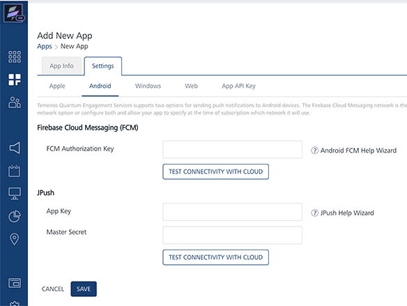- Click Test Connectivity with Cloud button to check if the FCM key is valid or not.