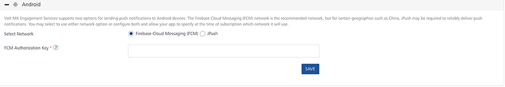 Support for Google FCM has been added in Volt MX Engagement Server post the V8 SP1 GA release. The Android platform supports Google FCM Push Notifications. This enables you to configure FCM service across Volt MX Iris and Volt MX Engagement Console.