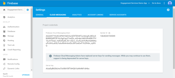- Copy the Server Key. You must provide the Server Key in the Engagement server while configuring an application to send push messages.