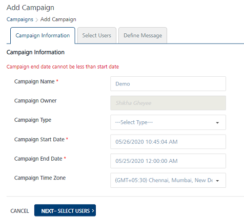 Note: You cannot move to the Select Users screen without providing the Campaign Name and Campaign End Date. The following error will be displayed on the screen.