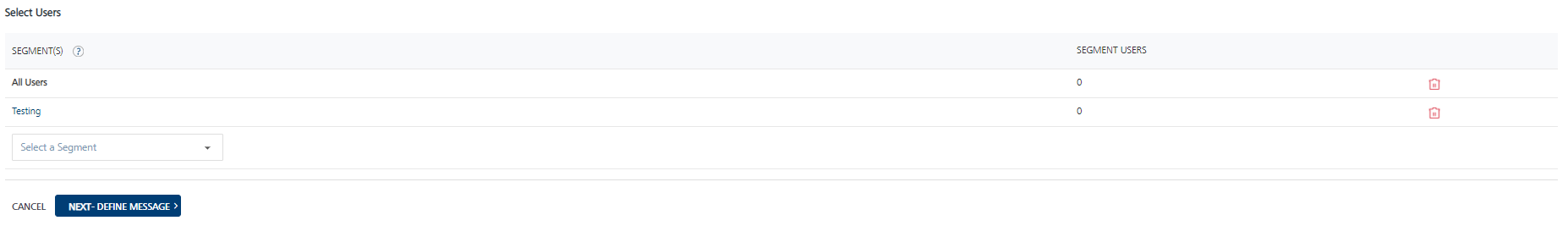 Note: You cannot move to the Define Message screen without selecting any users for the campaign. Providing a user Segment(s) is mandatory. If you do not provide a Segment the following error will be displayed on the screen.