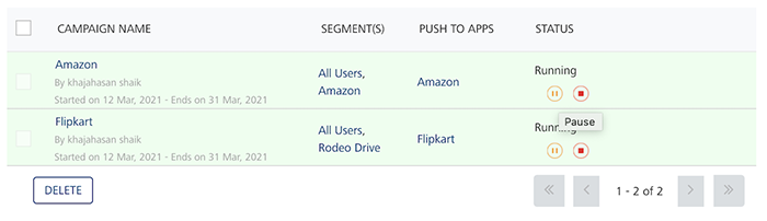 The system displays the confirmation message that the campaign is paused successfully. The color and the status of the paused campaign changes in the list-view.