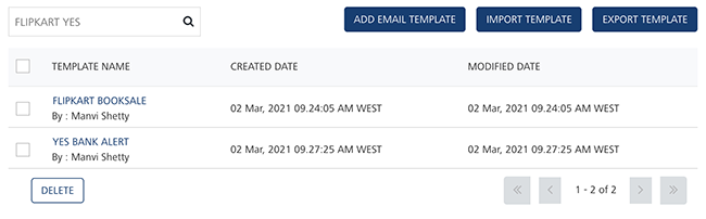 Searching without Labelling with Multiple Parameters: Enter the required parameters with a space in the search field. For example, the following image displays search result for two email templates based on entered parameters.