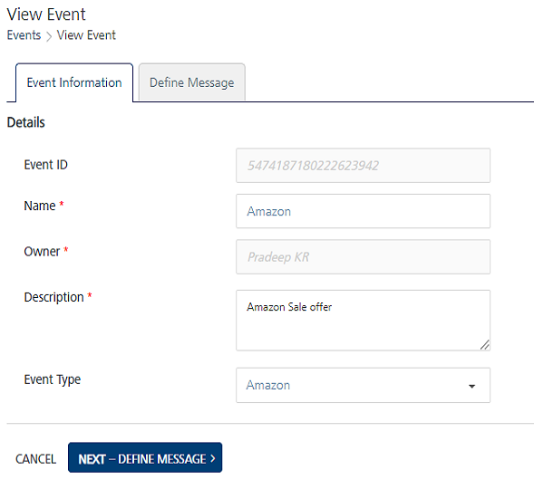 The View Event screen appears. The View Events page includes two tabs: Event Information and Define Message. By default, the Event Information tab is set to Active.