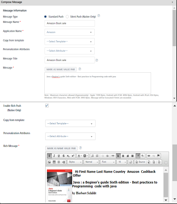 The Compose Message window appears. The Compose Message window displays all fields that you have used while adding the push message details.