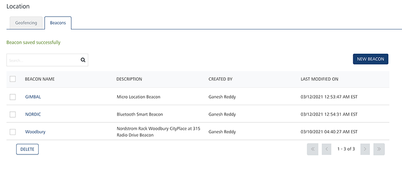 Beacon Element Description Beacon Name The column displays the names of the added beacons Description The column displays the description of the added beacons Created By The column displays the name of the owner who creates the beacons Last Modified on The column displays the date on which the beacon is last modified Display Controls By default, the number range is set to 20, so that only 20 beacons are displayed in the grid. You can view more beacons through the forward arrow icon. You can navigate back through the backward arrow icon. -