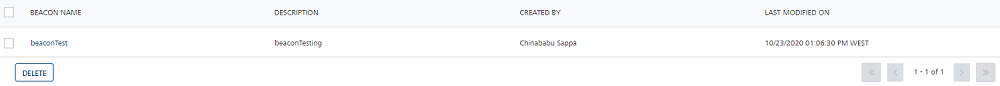 - Select the check box adjacent to the beacon name you want to delete, under the Beacon Name column. When you select multiple beacons to delete, only eligible beacons are deleted.