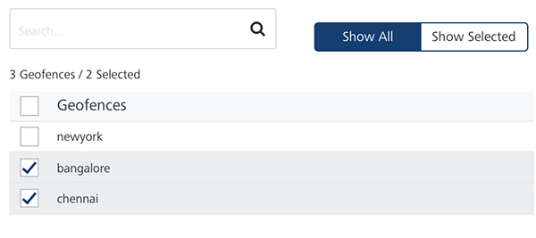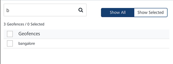 • Show Selected: The Show Selected tab displays the selected geofences in the list view.