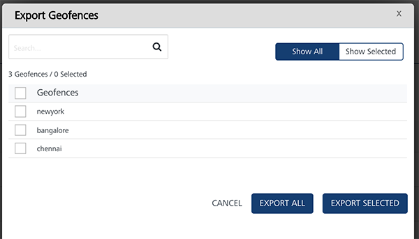 • Export Selected: Helps you export the selected geofence records from the Engagement server to a .CSV file.
