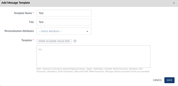Push Template Element Description Modification Allowed Template Name Push template name Yes Template Title Title of the template to be used. Yes Personalization Attributes There are default personalization attributes: First name, Last name, Email, Mobile number, Country, and State Yes Mark as Name Value Pair A key-value pair is a set of two linked data items: a key, which is a unique identifier for a data type, and its value: the data such as, county:Iowa, state: wisconsin Yes The added details appears in the message box window.