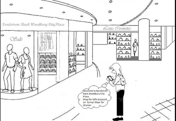 Mary works as an IT professional in Los Angeles. During a weekend shopping trip to Nordstrom Rack Woodbury CityPlace at 315, Radio Drive, Mary received an enticing alert on her iPad: an offer for a $20 discount on a formal office costume.