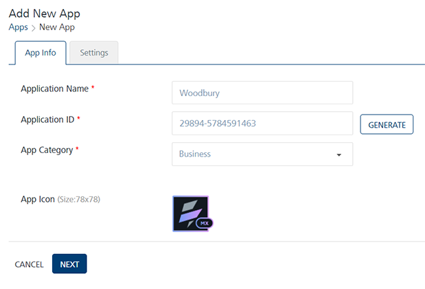 Lisa enters a name for the app such as Woodbury and select the app category from the drop-down list. Lisa clicks Generate to auto generate the Application ID.