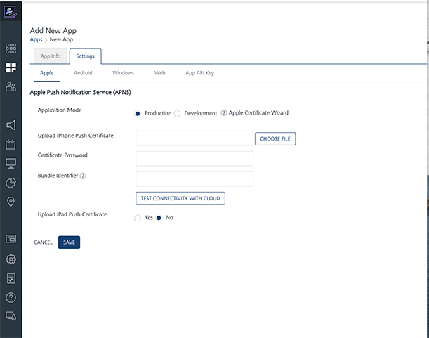 Lisa needs an app to connect with beacons and send notifications. The app should be developed cross platform so the campaign (including a segment with beacon users) can be received on all the devices (Android, Web, Windows, and iOS). In this section Lisa learns how to create an app in the Engagement server and enable it to send campaigns to customers. There are two basic steps to create an app.