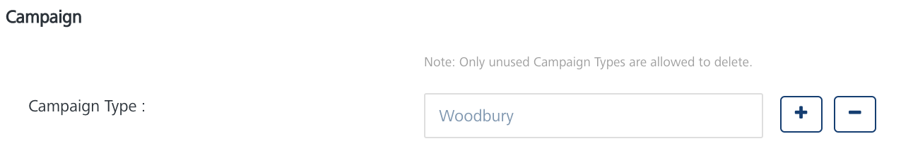 The campaign type is set when a new campaign is created and the name is commonly used to refer the specific campaign. Lisa adds a new campaign type as Woodbury.