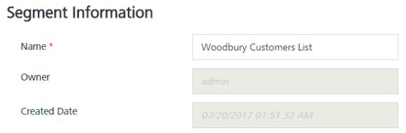 Name (mandatory): Lisa enters the name for the segment as Woodbury Customers List. Lisa receives a warning message, if a segment name is already defined. This warning is only a reminder that the segment is in use and Lisa needs to enter another name to define a segment.