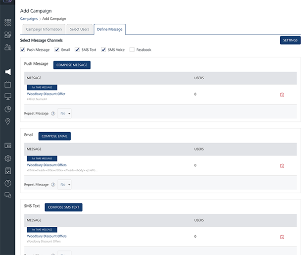 Lisa can choose push message, email, SMS or passbook notification channel to send the campaign message text for the Woodbury campaign.