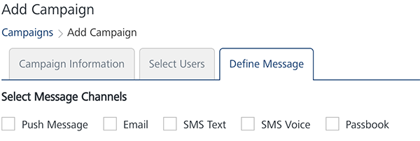 Lisa can choose push message, email, SMS or passbook notification channel to send the campaign message text for SellMe campaign.