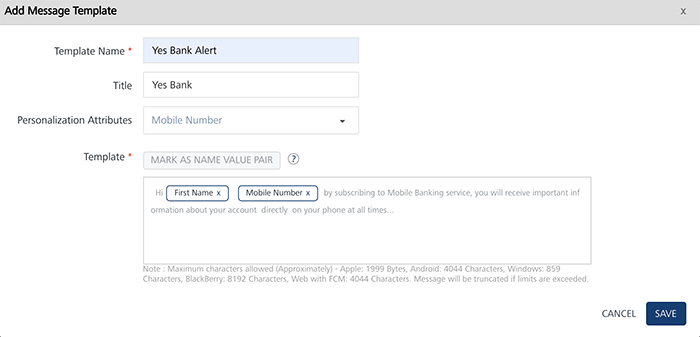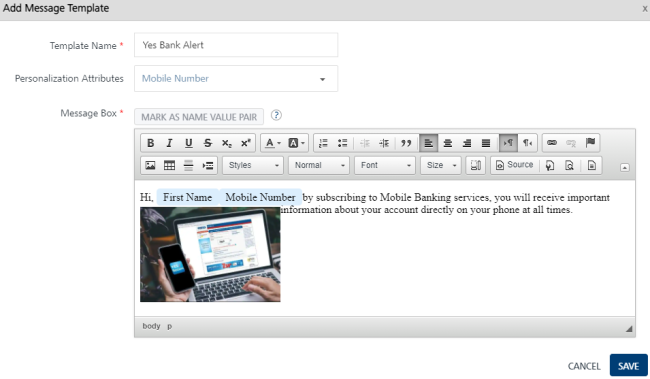 SMS is a really simple and accessible way of engaging customers. Usually customers receive text messages on a daily basis and are aware of this notification mechanism. So Lisa feels that SMS is a direct way to communicate the bank alerts to customers. Lisa can use tailor-made SMS message template that are supported by the Engagement server, to cater Yes Bank requirements.
