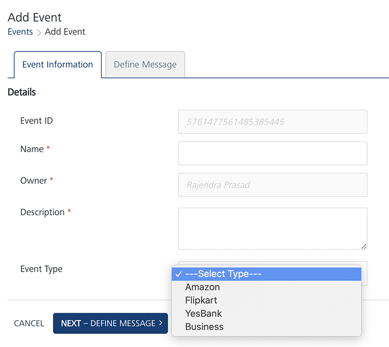 Event Type: Lisa needs to select the event type, such as Yes Bank from the Event Type drop-down list.