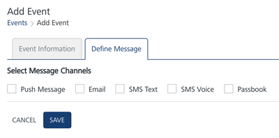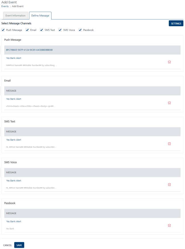 Lisa can choose push message, email, SMS or passbook channel to define message text for the Yes Bank event.