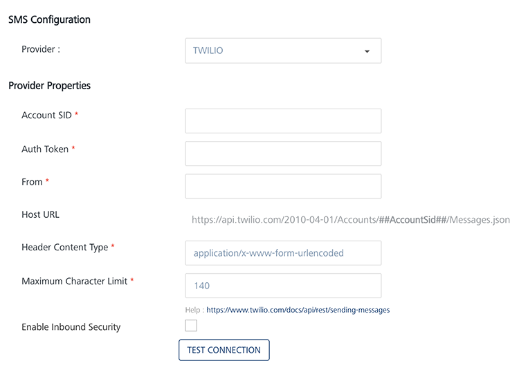 For more details about how to configure the SMS service provider's account, refer: Adding SMS Configuration