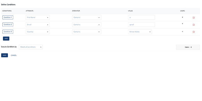 Select the execute condition as Match all conditions or Match any condition. Based on the fulfilled condition, the system inserts the number of users that qualify for the segment under the Users column.