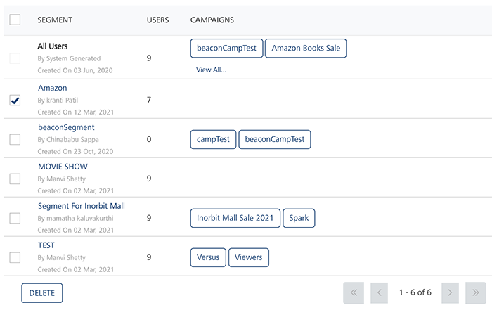 As an administrator, you can delete any segment as required. You cannot delete a segment associated with a campaign.