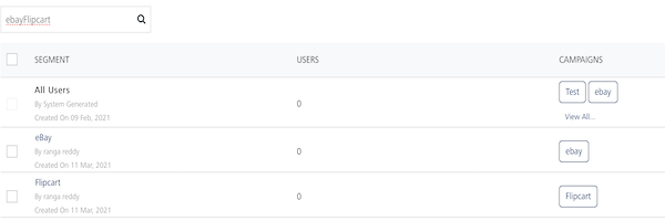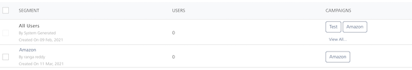 Important: By default, the Segment column displays All Users segment. The All Users segment includes all the users present in Volt MX Engagement Services. The All Users segment can be used in campaigns and adhoc messages.