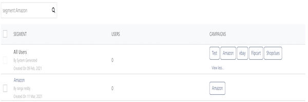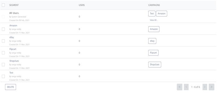 Segment Elements Description Segment The column displays the segment name. The following details are displayed below the segment name:- Name of the owner who added the segments- Date on which the segment is created Users The column displays the number of users who are linked with the segment Campaigns The column displays the number of campaigns associated with the segment Delete button The button helps you delete added segments from the list Display Controls By default, the number range is set to 20 so that only 20 segments are displayed in the grid. You can view more segments through the forward arrow icon. You can navigate back through the backward arrow icon. -