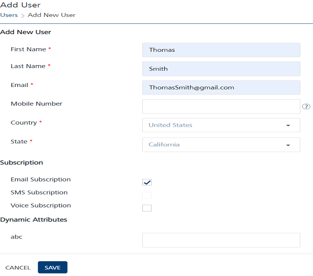 Based on your requirement, you can create dynamic user attribute types and specify them as optional or mandatory. For example, you create a new user, Thomas Smith, and enter all the necessary details to create a new user on the Add User page.