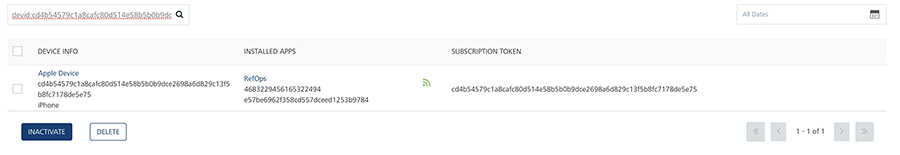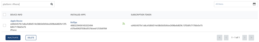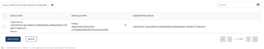 The green subscriber icon indicates that a device is active to that application, and can receive push notifications.