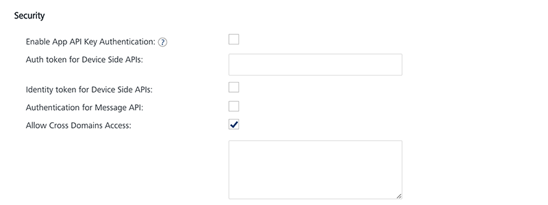 Configuration > General > Security: Ensure that the Identity Token for Device side APIs and Authentication for Message API are not checked.
