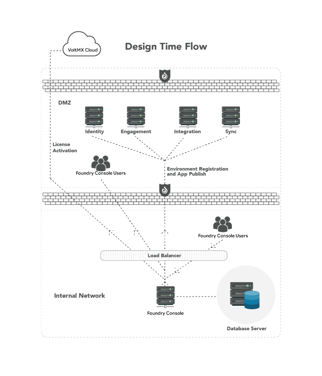 The following diagram depicts the topology of a typical deployment of Volt MX Foundry in a Production environment. Individual components can vary based on specific requirements.
