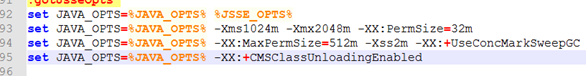JVM Options on Linux (64-bit) Additional options for all application servers EXPORT JAVA_OPTS="$JAVA_OPTS -XMS1024M -XMX2048M -XX:PERMSIZE=32M"EXPORT JAVA_OPTS="$JAVA_OPTS -XX:MAXPERMSIZE=512M -XSS2M"EXPORT JAVA_OPTS="$JAVA_OPTS -XX:+USECONCMARKSWEEPGC"EXPORT JAVA_OPTS="$JAVA_OPTS -XX:+CMSCLASSUNLOADINGENABLED" For Oracle export JAVA_OPTS="$JAVA_OPTS -Doracle.jdbc.defaultNChar=true" Additional options for JBoss export JAVA_OPTS="$JAVA_OPTS -Djavax.xml.soap.MessageFactory=org.apache.axis.soap.MessageFactoryImpl" export JAVA_OPTS="$JAVA_OPTS -Djavax.xml.soap.SOAPConnectionFactory=org.apache.axis.soap.SOAPConnectionFactoryImpl"export JAVA_OPTS="$JAVA_OPTS -Djavax.xml.soap.SOAPFactory=org.apache.axis.soap.SOAPFactoryImpl" Additional options for JBoss EAP 6.0.1 export JAVA_OPTS="$JAVA_OPTS -Djavax.xml.transform.TransformerFactory=org.apache.xalan.processor.TransformerFactoryImpl" -